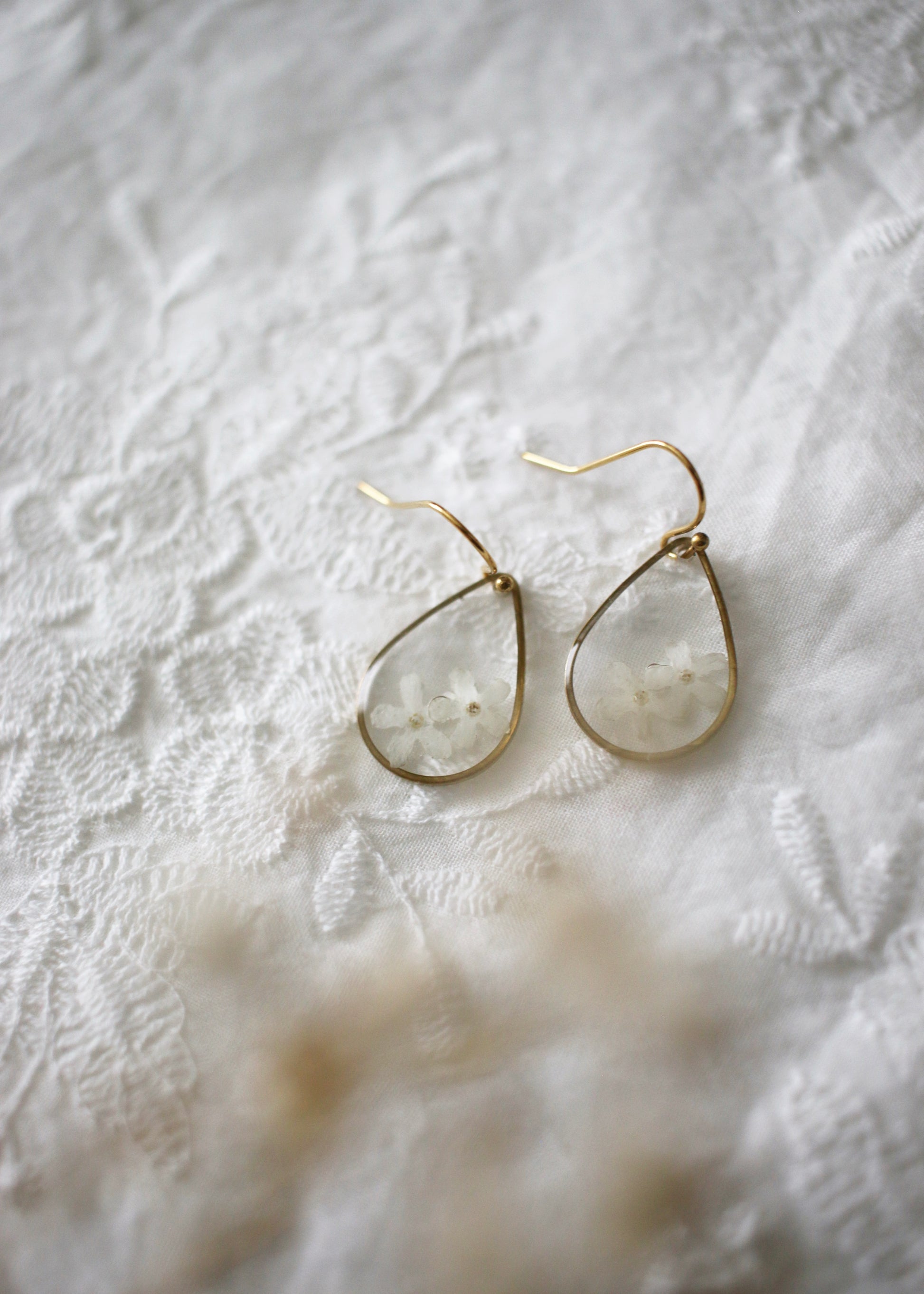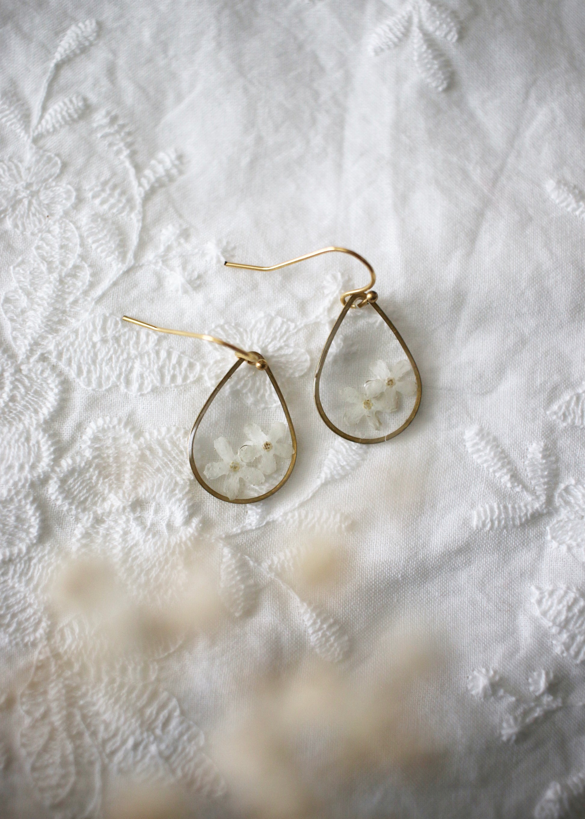 A dainty pair of handmade earrings, featuring delicate white forget me not flowers in a drop bezel