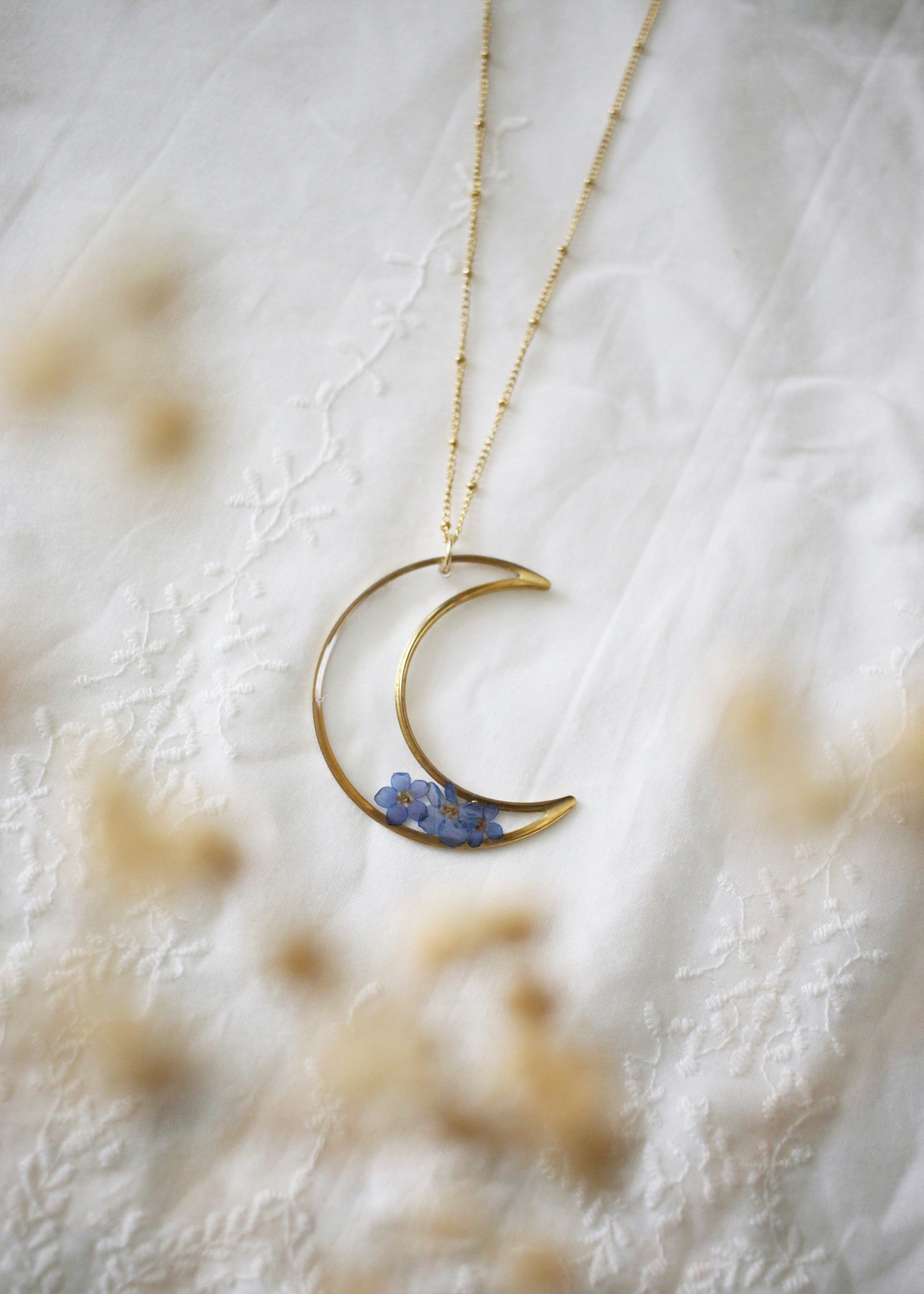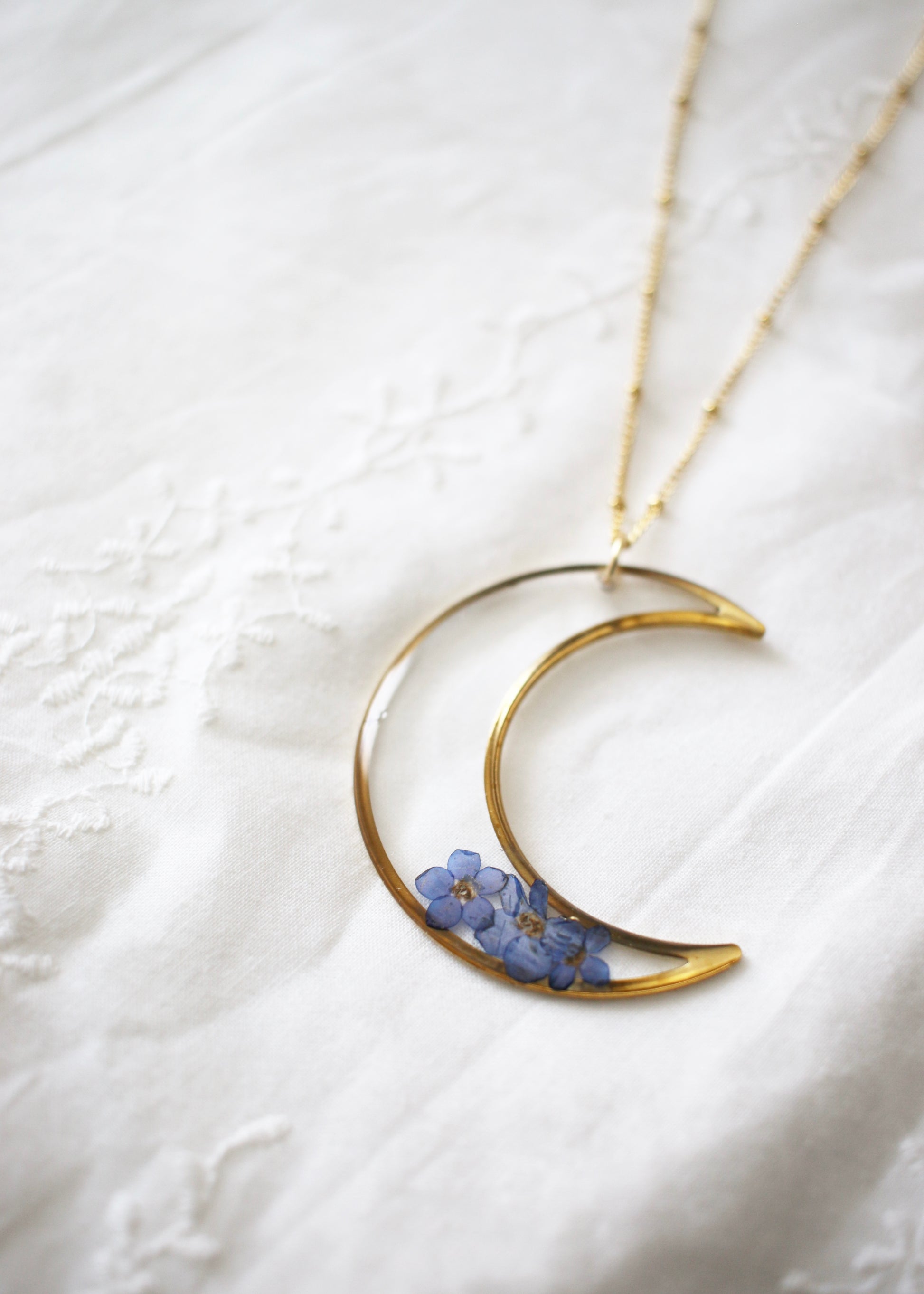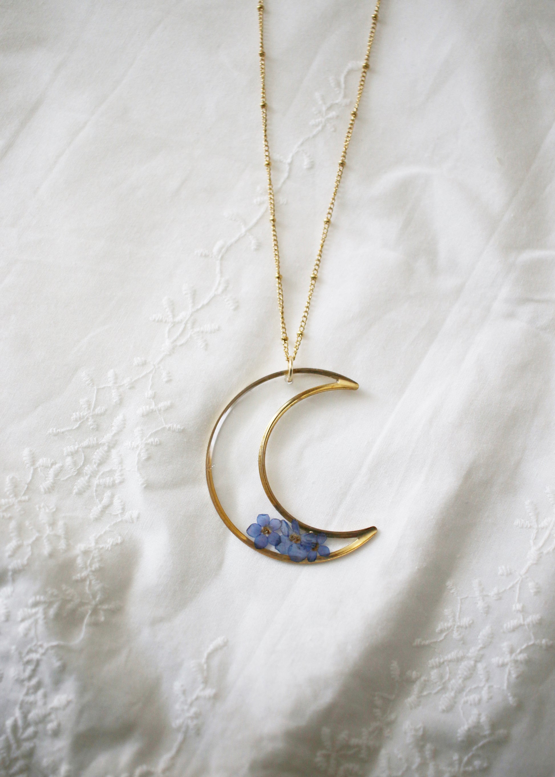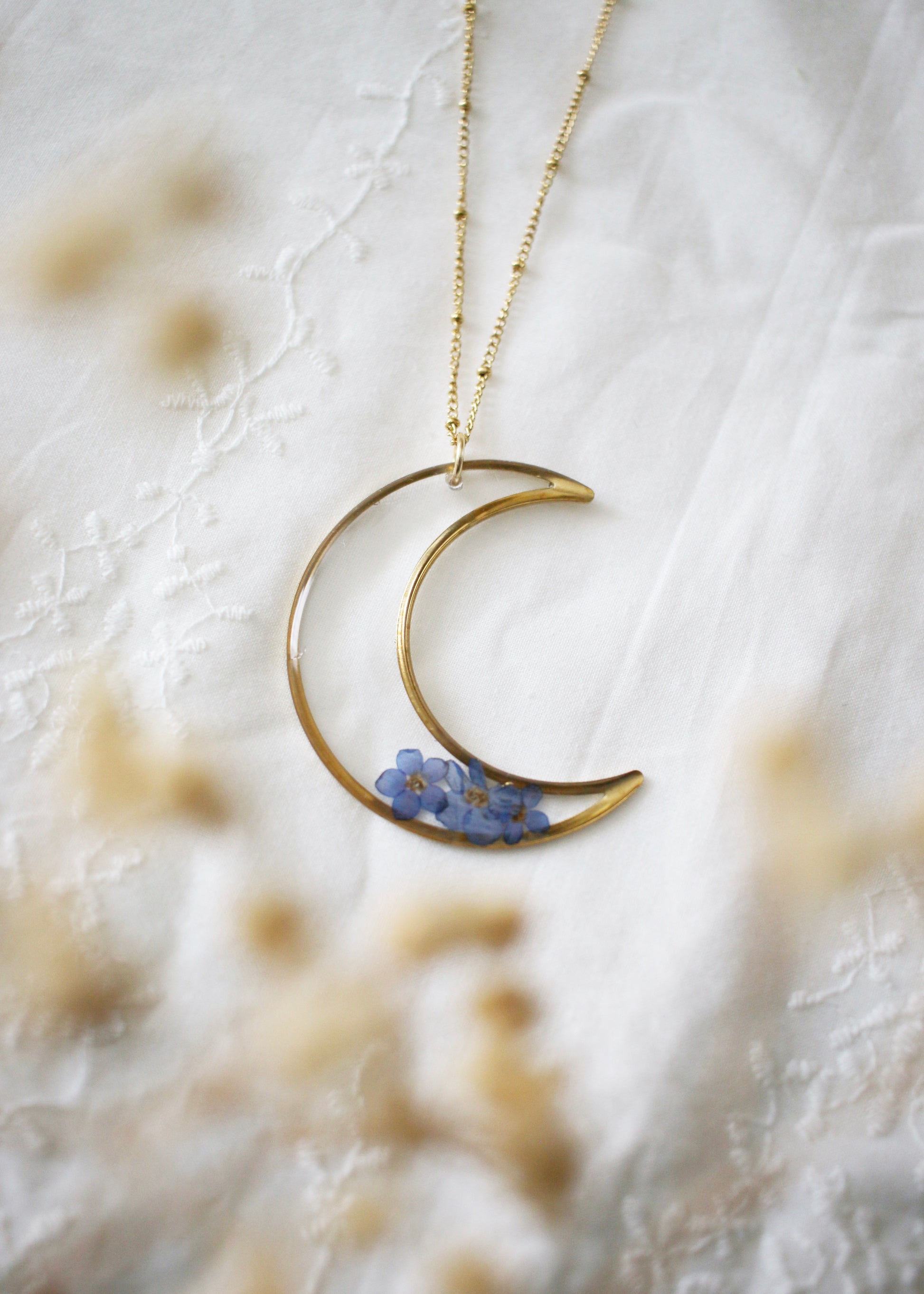 A limited release of a beautiful moon pendant featuring traditional hand pressed forget me not flowers. This keepsake honors our loved ones.